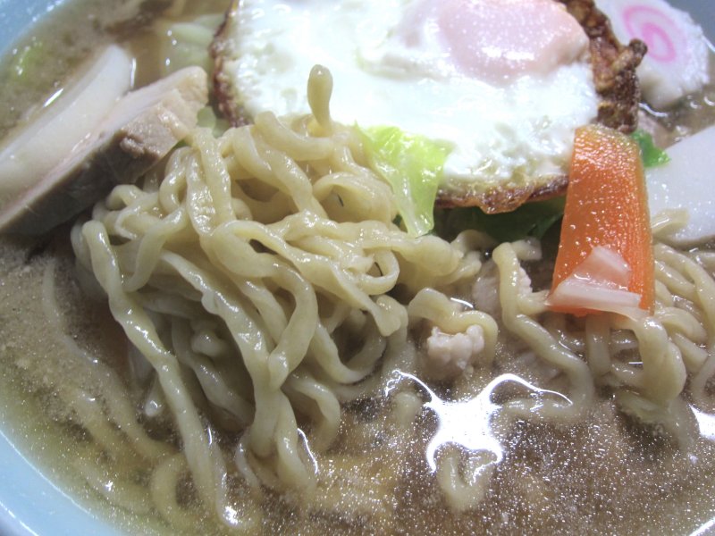 スープを啜ると、シンプルな昔ながらのシンプルなもの。チャーシューはバラ肉で、好み。でも、このチャーシュー、味付けがあまりしてない感じで醤油で煮た、煮豚ではなく、湯で煮た、茹で豚って感じかな。麺は手打ち?のちぢれのある太麺。パサついた感じかなと思ったけど、けっこうモチッとしてますね。 |