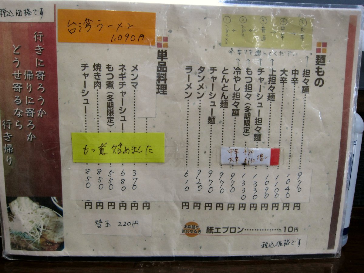 メニュー見ると、担々麺だけでなく普通のラーメンとかもあったのね。とはいえ、こちらに寄るのは勝浦式タンタンメンしかないよね。ということで、チャーシュー担々麺\1330を辛さひかえめでお願いしました。辛さを選べるようになったのね。辛いのに弱いからうれしいよ。 |