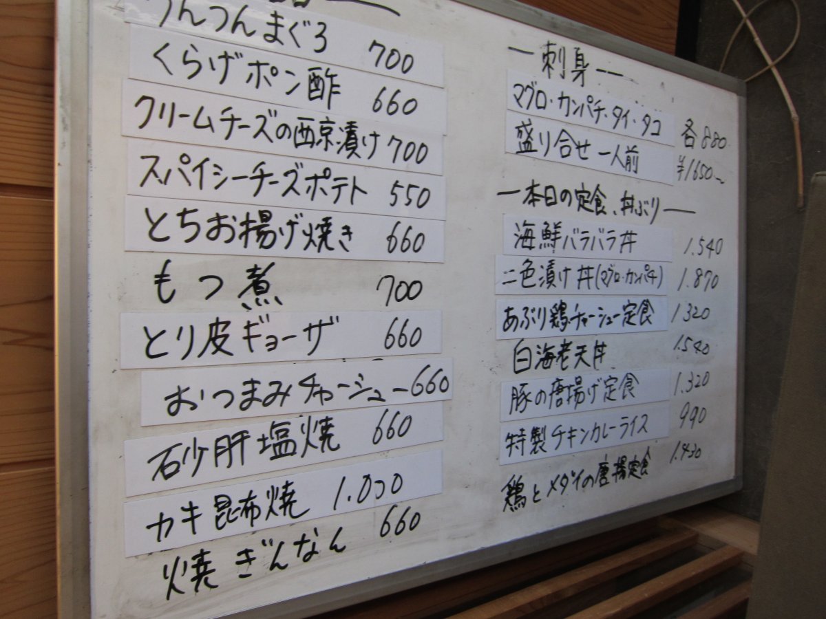 こちらは夜のメニューかな?酒の肴に美味しそうな物が並んでいますね。 |