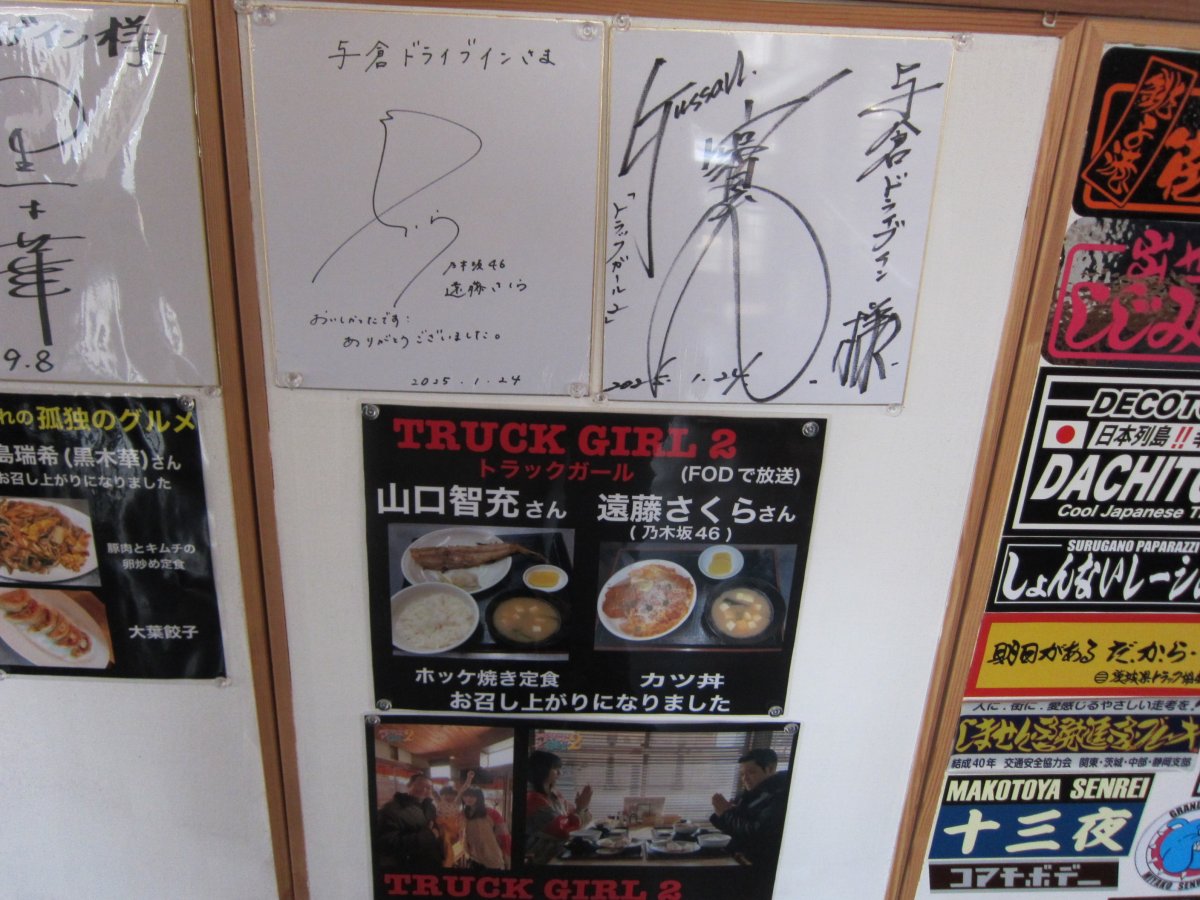店内はテーブル席と小上がりもあります。酒呑んだ運転手さんはしっかり休んでから出てねと、優しいお言葉。でも、最近の法律ではマズくない? トイレは外にあり、仮眠してる運転手さんにも配慮しているのかな? |