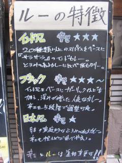 メニューはチキン、ビーフ、カツカレー、メンチカレーなどいろいろな種類があります。さらに、辛さもいろいろと選べます。で選んだのは、ビーフ入りカレーの少々辛口\870です。カレー屋に行っていつも思うのは、いろいろな種類のカレーって、ルーもいろいろと作っているのか?ってこと。作るのを見ていると、基本のカレーは2種類だそうで、そこにいろいろな具を入れて違いを出すようです。 |