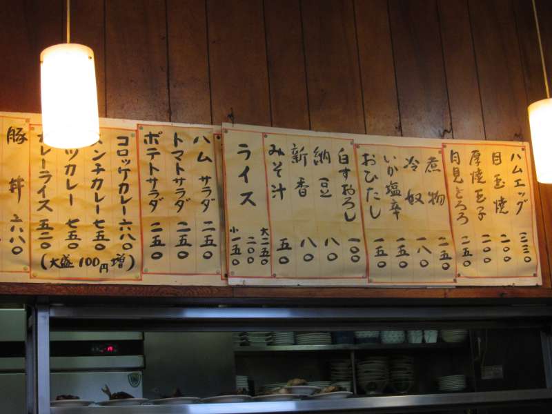 メニューも昔ながらの食堂って感じの品々が並びます。何を食べようかと思いながら、暑さに負けてまずはビールと煮込み\380で軽く一杯です。 |