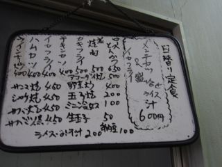 メニューに書かれているのは、どれも単品のようです。単品に+\200でご飯、みそ汁をつけると定食になります。何を食べようかと迷いましたが、暑い日だったのでビールはないかと聞くと、しっかりとありました。 |
