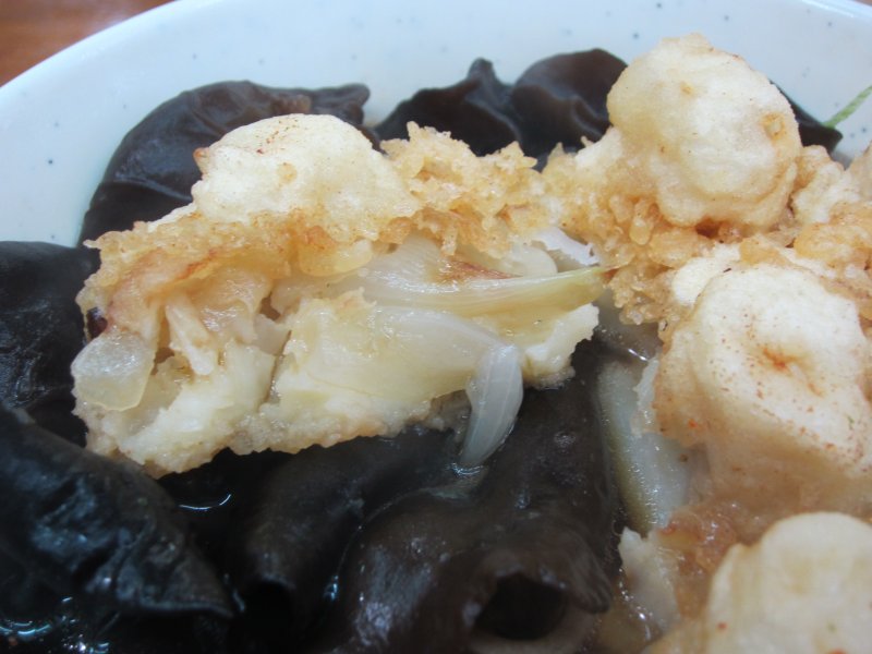 貝柱かき揚げが軟らかくなるまで木くらげをね。こちらは天ぷらじゃないからね。コリコリ感がたまらんね。 柔らかくなった貝柱は玉ねぎの座布団の上に貝柱を載せて揚げたもの。時おり口に入る貝柱がいい味出してるのよ。ちょいお高めだけどもね。ごちそうさまでした。 (26.2) |