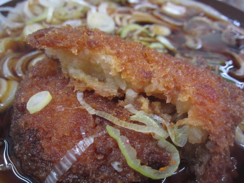 ここのコロッケは柔いので、運ばれたらすぐに食べないと、とろけて、つゆの中に混ざっちゃうからね。普通のじゃがいもコロッケです。 |