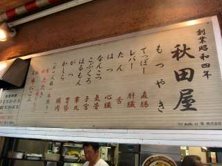 以前から訪れてみたかった浜松町のもつ焼きの名店、秋田屋。昭和4年創業の老舗です。浜松町のお隣、田町でお仕事があり早めに終わったので、思わず寄ってみました。17時前に訪れたのですが、店はすでに満席状態。う〜ん、恐るべし秋田屋です。 |