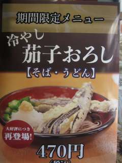 今日は暑いから、期間限定の冷やし茄子おろしそば\470ね。 |
