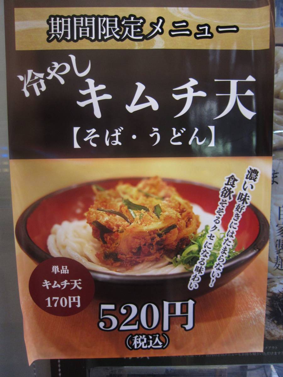 かのやの今月の期間限定蕎麦は、なんと、キムチの天ぷらを載せた、冷やしキムチ天そば\520です!怖いもの見たさだね。 |