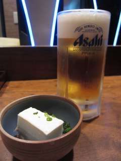 まずは生ビール\580で喉を潤します。いらないお通し\300は豆腐の煮こごり風?ですかね。 |
