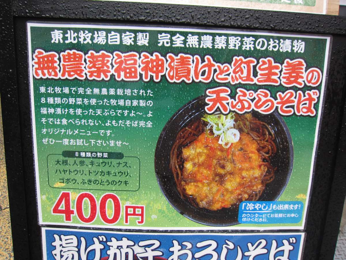 今日のよもだそばは、よもぎ天そば\420ににら天\120を追加ね。 |