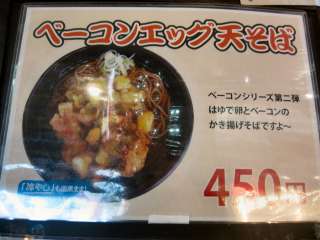 今日のよもだそばは、期間限定のベーコンエッグ天そば\450ね。 ここしばらくは、ベーコンシリーズが続くみたい。今回は第2弾だそうで、第1弾は見逃してた〜(^-^ゞ |