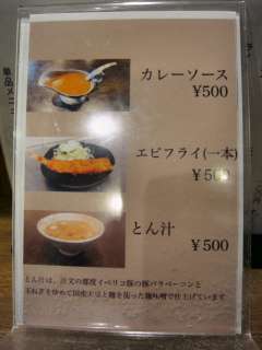 メニューを見ると、とんかつセット(定食)とエビフライセット(定食)ととん丼の3つのみ。今回は、王ろじが発祥という、とん丼\1200をね。こちらは、カツカレーのことなんです。そして、とん汁\500も追加してみました。 カツを揚げるのに13分ほどかかるというので、ゆっくりと待ちます。 |