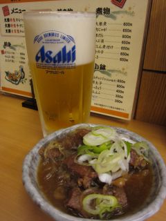 メニューを見ると、刺身や焼き物、煮物などいろいろと揃っています。何を食べようかと悩みますが、やはり下町の味、煮込みしかないでしょ!と言うことで、生ビール\600と牛すじ煮込み\600をいただくことにしました。 |