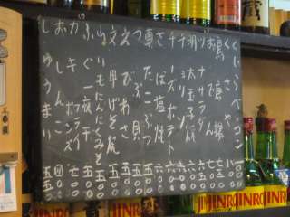 店内はカウンターが10席ほどと小上がりがありますが、小上がりは店主さんの荷物で埋まってる… お客さんも常連さんばかりで、一見さんには居づらい雰囲気ですね。場外馬券売り場が近いこともあってか、テレビは競馬中継。お客さんは結果に一喜一憂しております。 メニューは黒板メニュー。仕入れによって毎日?変わるんでしょうかね。 |