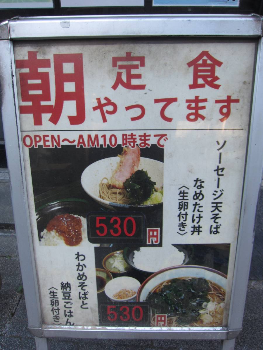 まだまだ暑いから、朝定食のソーセージ天そば+なめたけ丼\530を冷やし+\50にしてもらってね。 |