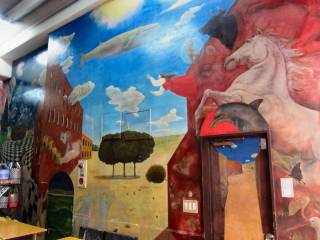 驚いたのは、右手の壁に大きな絵が描かれていること。酒を卸している、芸大の学生さんが描いてくれたそうです。 |