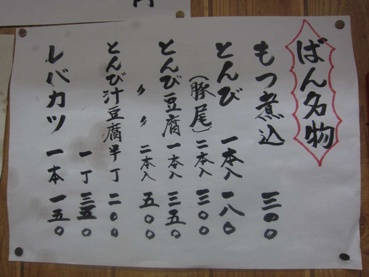 メニューはもつ焼きなどをはじめとしていろいろとあります。刺身などもありますが、チラッと見たらそれも安くって\500を越えるようなものはないみたいですね。 |