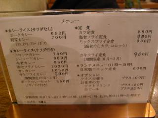 メニューはカレーがメインですが、カツや海老フライなどの定食もあります。今回は基本?のポークカレーを大盛りでお願いしました。\650+\100也です。 |