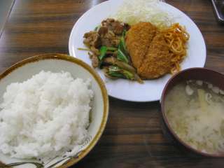 ちょっと時間がかかって出てきた定食は、豚肉と玉ネギ、そして珍しくキャベツも入った生姜焼きと野菜コロッケ。そしてケチャップ味のナポリタンと千切りキャベツです。生姜焼きの豚肉は小間切れでちょっとボリューム感が欠けるかも知れません。口に入れると生姜焼きと書かれていますが、焼肉のタレで味付けしてあり、ちょっと甘め。コロッケは揚げたてでサクサクしていて美味しかったです。 (09.6) |