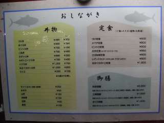 メニューはづけ丼\490、まぐろ丼\690、ビントロ丼\790、ネギトロ丼\690などのマグロメインの丼ものやづけ定食\600、メバチ定食\800、刺身御膳\2200などのご飯ものだけでなく刺身や酒の肴、酒もメニュー豊富です。今回はちょっと奮ってまぐろ御膳\1200を注文しました。 |