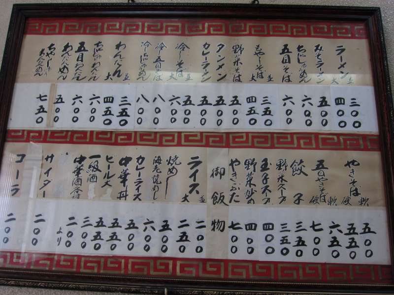 メニューを見て驚くのが、その安さです。何とラーメンが今時\200!大盛りでも\300です。他にやきそば\500、焼きめし\500、カレーライス\500、餃子\350などがあります。今回はラーメンと餃子を注文しました。 |