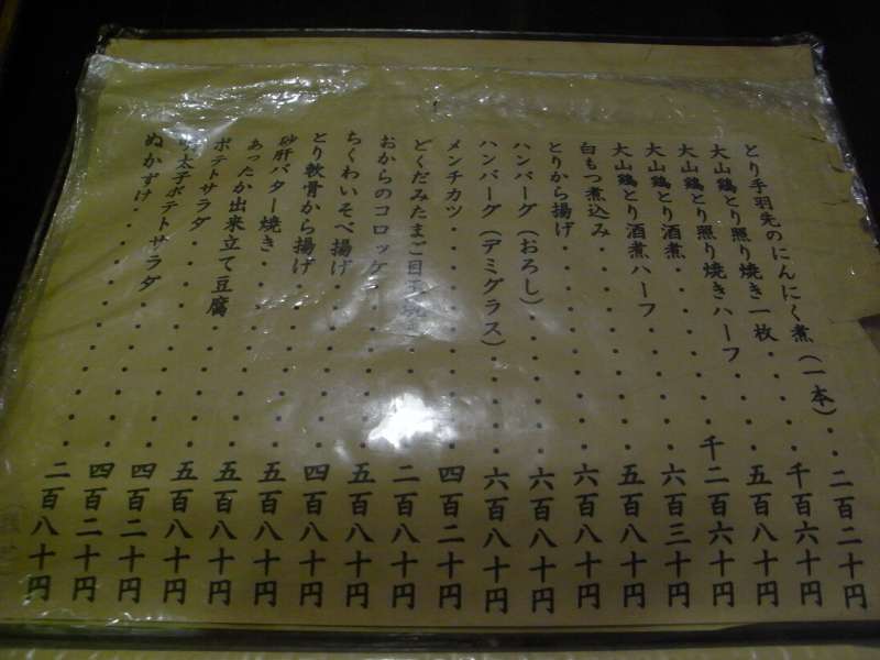 三軒茶屋の迷宮にある小さな食堂です。以前から気になっていて、22時過ぎに訪れたのですがまだ開いておらず、深夜にならないと開かないようです。今回は残業で遅くなったので、開いていればと思って23時過ぎに寄ってみたところ、開いていたというわけです。店内は10人も入ればいっぱいになってしまう小さなもの。何となく懐かしくなる造りの中にジャズが流れていて、食堂とは思えない雰囲気です。 |