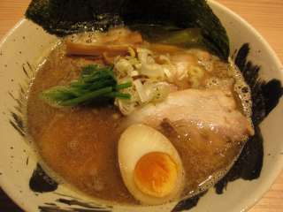 そんなに待たずに運ばれたラーメンは、チャーシューが3枚と大きめのメンマ、海苔3枚、味玉、ほうれん草、刻みネギが載っています。見た目は家系のラーメンっぽいものを感じます。まずはスープを啜ると魚介を感じるもので、見た目の家系とは違ったものです。ちょっとざらつきを感じる濃厚なもので、最近流行の濃厚豚骨&魚介のスープですね。う〜ん、なかなか美味しいです。麺は平打ちの中くらいのストレート。つけ麺とは綿を変えているそうです。チャーシューはバラ肉を使ったもので、柔らかく、とろける感じでした。ほうれん草は色といい歯応えといい、いいアクセントなんですがちょっと量は少なめなのが残念です。 (12.4) |