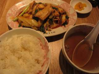 注文してそうそうに運ばれた豚キムチは、けっこうなボリュームです。豚肉とキムチ。そしてタマネギなども一緒に炒められています。辛さに弱いhiroですが、そんなに辛みを感じることもなく美味しくいただくことができました。ご飯が進んでしまい困りました。 (13.11) |