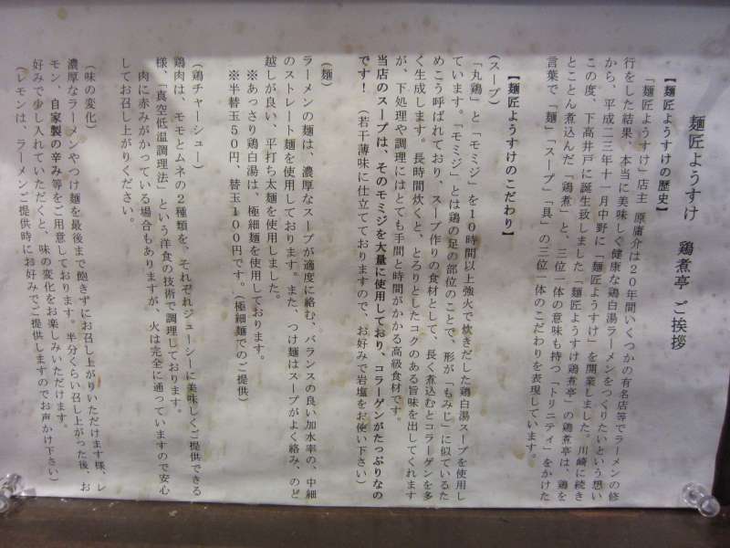 最近できた鶏白湯ラーメンの店です。以前あったうまいの亭が修行した店の名に変えたそうです。どうしてなんでしょうかね?メニューがちょっと増えたようですね。 |