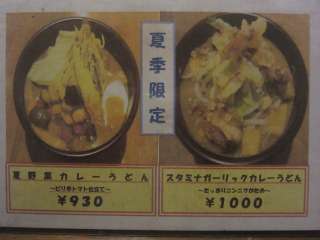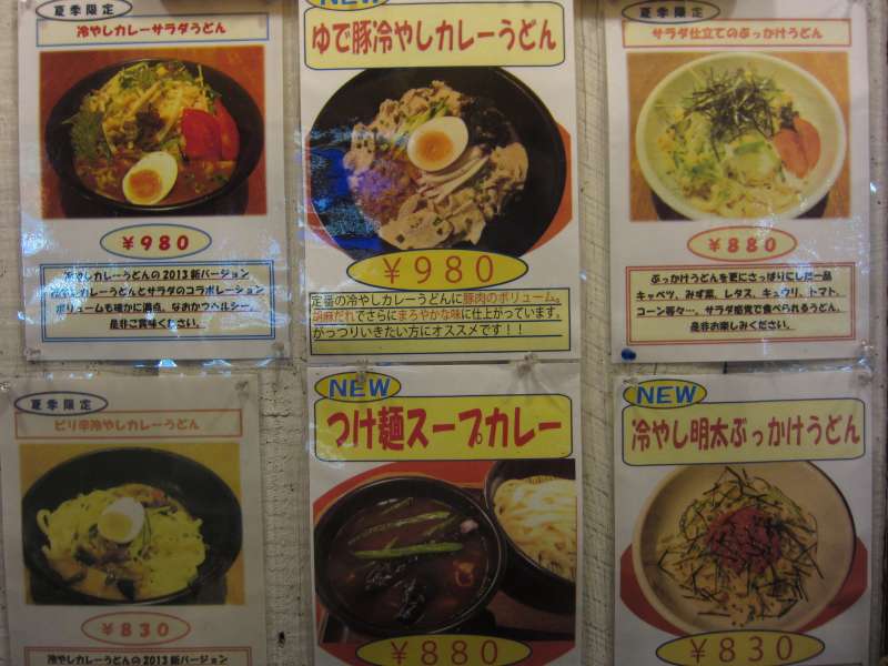 注文は口頭でして食後に精算する方式。基本のカレーうどん\680から始まって夏らしく冷やしカレーうどん\780。そして揚げ物などのトッピングでバリエーションを出しています。今回は冷やしカレーうどんをいただくことにしました。 |