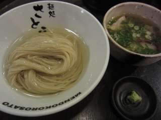 麺はややとろみのある汁の中に盛られています。これが昆布水なんでしょうかね。そんなに昆布とか旨味は感じなかったな。 麺はつけ麺としてはかなりの細麺。普通のラーメンに使うものなのかな?つけ汁に浸けて麺をいただくとするスルッと喉を通りすぎていきます。濃厚魚介系と違ってあっさりしているからなのかな?それとも細麺だからかな?もうちょっとボリューム感が欲しいかな。ごちそうさまでした。 (18.9) |