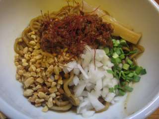 まずは混ぜ混ぜして味と具をならします。箸を付けると、う〜ん、そんなに辛くはありませんね。ピリ辛くらいで、辛いのが苦手なhiroにも食べやすいです。麺は太麺で、しかもかなりのボリューム。麺は具や辛みを一緒に引き上げます。 |
