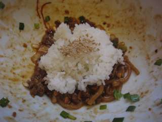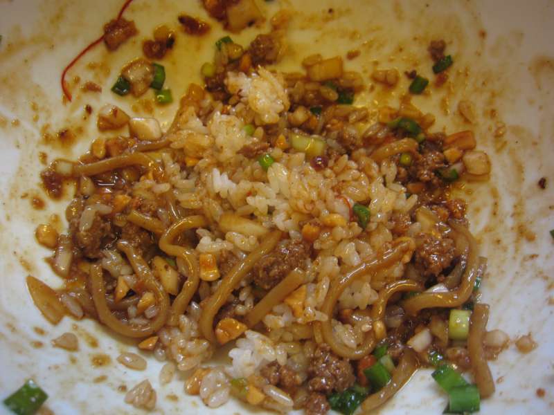 麺を食べ終えたら、残った具とタレの上にご飯を載せます。こちらも混ぜ混ぜしていただきます。ご飯もタレと馴染んでおいしくいただけます。思ったよりご飯が多くて、食べきるのが辛かったかな。ごちそうさまでした。 (17.7) |
