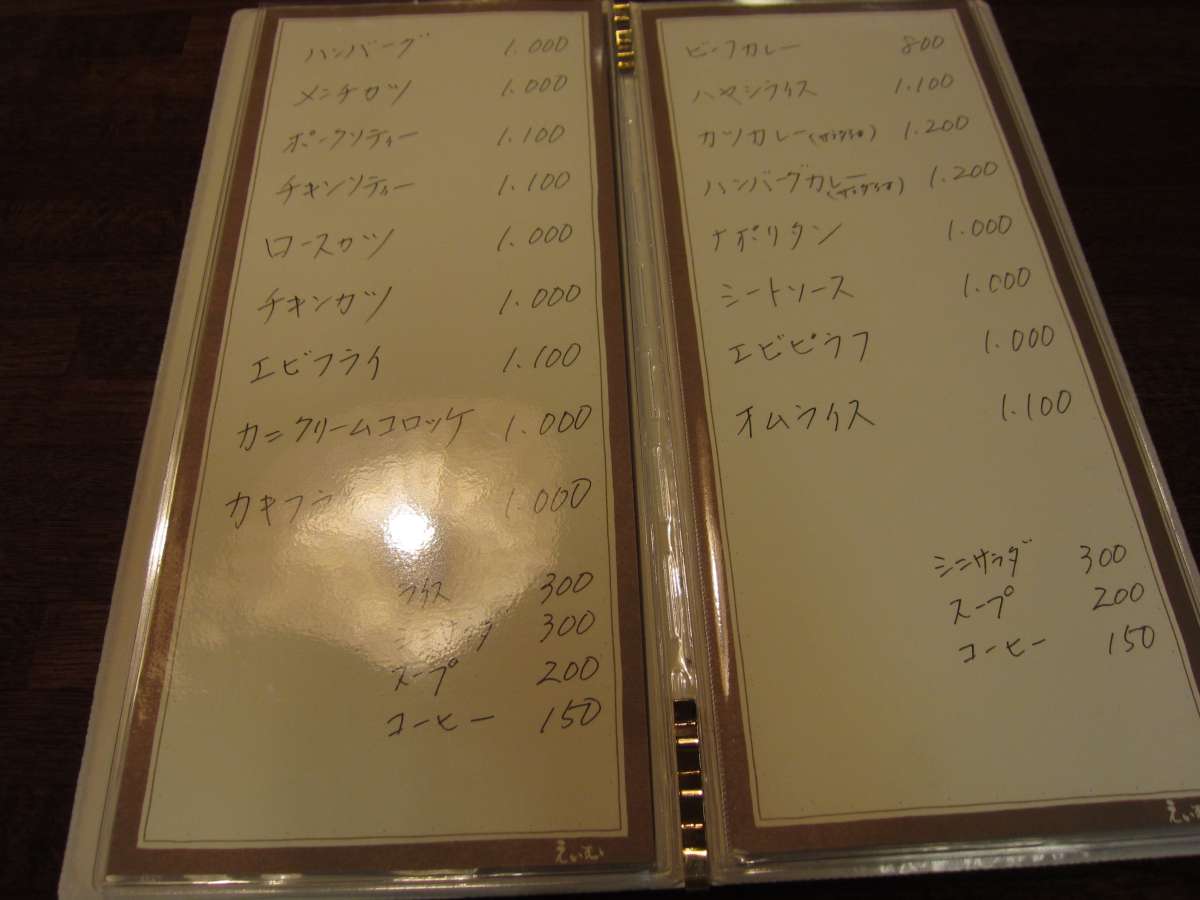 メニューもそんなに多くはありませんが、ステーキやハンバーグ、カレーライスなど昔ながらの洋食、というメニューが並んでいます。今回は初めてということもあって、洋食の基本?オムライス\1100をいただくことにしました。 |