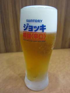 水分補給のためにまずは、生ビールと餃子セット¥500です。ジョッキを期待してたんですが、残念ながらビールグラスね。餃子が焼き上がる前に空になっちゃうよ! |