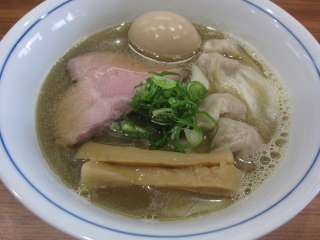 しばらくして運ばれたラーメンは、グレーがかったスープにチャーシュー2枚にワンタン4個、味玉。そしてかち割りメンマと刻みネギなどが載っています。スープを啜るとしっかりと煮干しの風味が口の中に広がります。やや塩分濃いめですかね。麺はストレートの細麺。チャーシューは盛る前にバーナーで炙って載せています。ロースでしょうか、厚みも大きさもあり、しっかりと食べ応えがあります。崩れてしまうほど煮込んだチャーシューよりも肉を食べている感じがして好きですね。ワンタンはてるてる坊主の形をしたもの。かなり生姜が利いたもの。しっかりとボリュームがあり、食べるタイプのワンタンですね。味玉はもう少しで黄味が固まる直前の半熟状態。美味しいですね。ややお値段高めかと思いますが、美味しいラーメンでした。ごちそうさまでした。