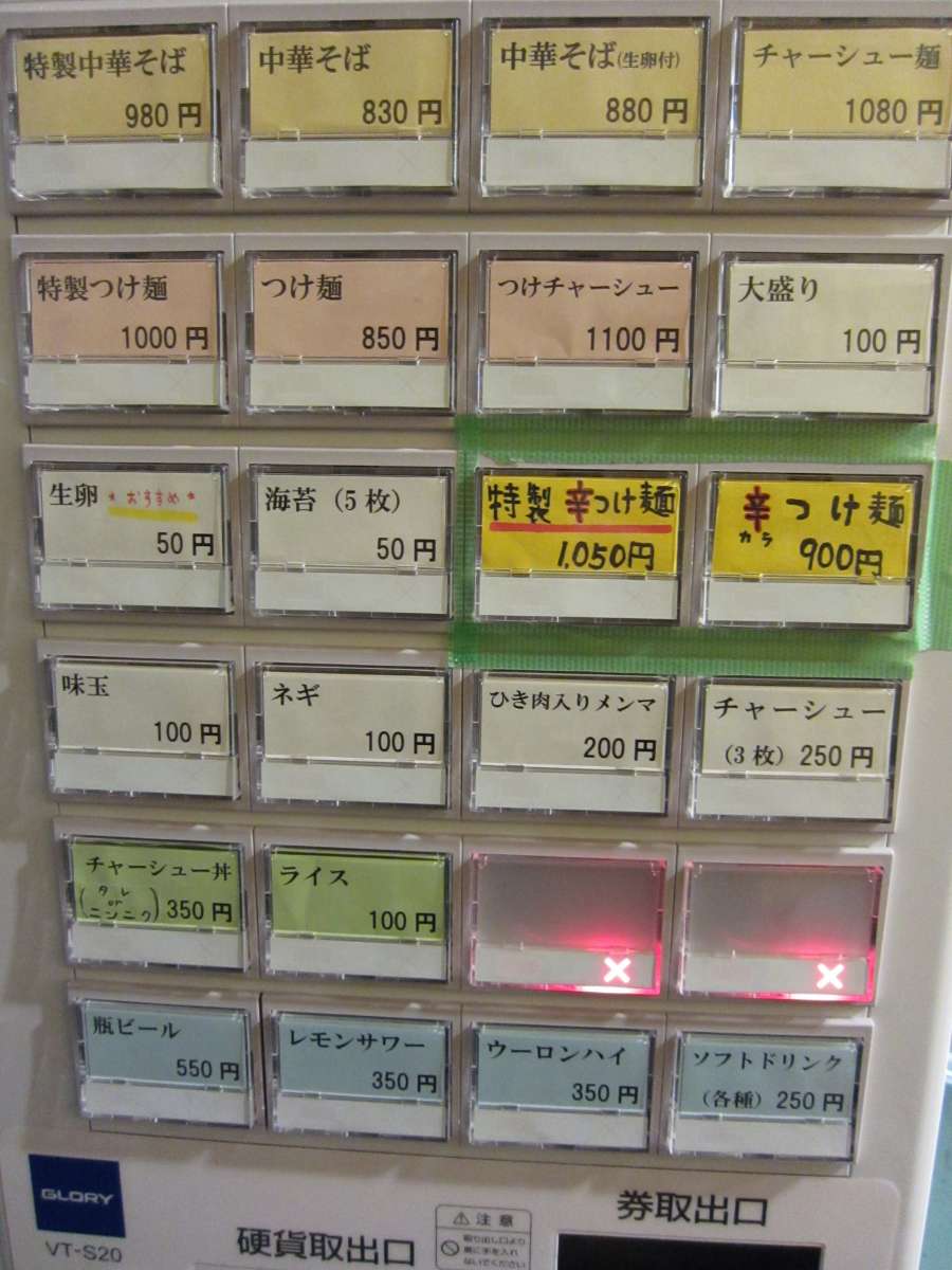 注文は入口の券売機で食券を買う方式。中華そば、特製中華そば、つけそばなどがあります。中華そばが¥830でチャーシュー増しに味玉が付く特製が¥980なので、ここは特製をね!ちなみにデフォルトで麺量が300g だそうで、小盛りにすると味玉や海苔などを追加してくださるそうです。 |