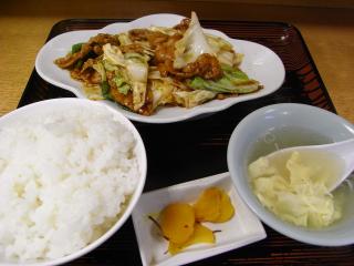 今回は中華の定番?のホイコーロ定食\750を注文しました。注文は入口前にあるレジでの前払い方式となっています。注文すると中華らしく素早く料理が出てきます。メインのホイコーロのほかにご飯、玉子スープ、漬け物も一緒に出てきます。値段の割にボリュームたっぷりでお腹も満足しそうです。ホイコーロは豚肉とキャベツの他にピーマンが入っています。唐辛子が入っていてピリ辛。ご飯がすすんで困りました (^^ゞ (08.11) |