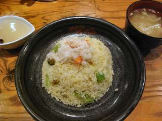 チャーハンだけあってそんなに待たずに運ばれてきます。玉子とレタスのチャーハンの上にかにのほぐし身が載ったチャーハンとかにの味噌汁。そして好みでかけるあんかけがセットになっています。 まずはチャーハンを食べてみると、けっこうパラパラとしていて、ベチャッとしたアブラっぽいチャーハンよりも上品で食べやすいですね。かにはご飯と一緒に炒めてあるのかと思ったのですが、載せる方がインパクトありますね。あんかけをかけると、とろみが加わりまたひと味違ったものになります。でも、お値段を考えるとちょっとボリューム少ないし、満足感低いかな? (10.11) |