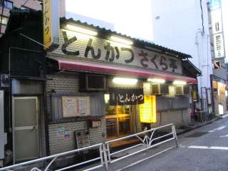 渋谷駅でもあまり話題にならない、桜丘方面。高校生の町、渋谷と言われていますがそんなイメージとはかけ離れた、小さな居酒屋などが並ぶ雑多なイメージ場所であります。そんな中でもさらにB級的雰囲気を漂わせるとんかつ屋がさくら亭です。前からちょっと気になっていたので寄ってみました。店の前には、「ご飯おかわり1回無料」「ご飯にカレーかけます」なんて掲示がしてあります。さらにお値段が安い!オススメの品\750なんてかかれたとんかつ定食なんて、泣かせます。 |