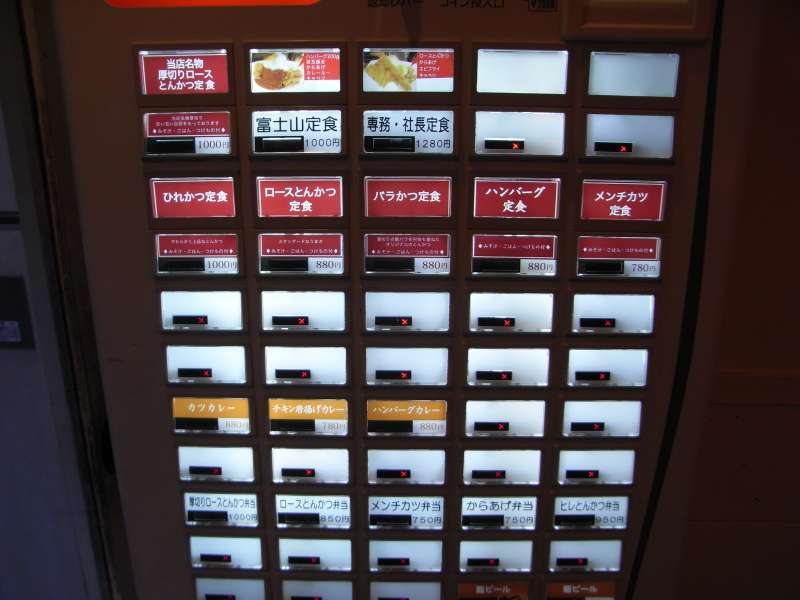 注文は入口の券売機で食券を買う方式です。以前のメニューと比べると、う〜ん、ガッツリ度が低くなっているような気もします。それだけでなくメニューが少なくなっているようにも思えます。今回は店のお勧めという、厚切りロースとんかつ定食\1000を食べてみることにしました。 |
