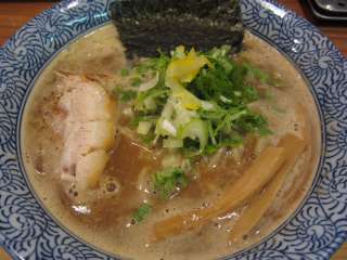 しばらくすると、名の通り、濃厚そうなスープの中華そばが運ばれました。かなり濃そうなスープに厚めのチャーシューが2切れと大きめのメンマ、刻みネギ、刻み玉ネギ、刻み水菜?が載っています。 まずは一口スープを啜ると、う〜ん、見た目同様にかなり濃い!の一言です。魚粉?のザラザラ感と共にとろみを感じます。普通の濃厚魚介と呼ばれるつけ麺のつけ汁ほどの濃さはあるのではないでしょうか。麺は中太のもので、渋谷マンモスではもっちり麺と呼んでるものと同じようで、モチモチッとした歯応えです。久々に濃厚な中華そばを食べられて満足なんですが、渋谷価格なんでしょうか?ちょっとお高めのお値段だけは勘弁してほしいです。 (12.6) |