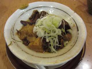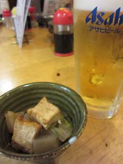 メニューは売りのおでんと焼き物の他にも刺身などいろいろ揃っています。何を食べようかと迷ってしまいます。でも、おでん目当てに寄ったので、外せませんね。まずは定番の大根\180、こんにゃく\180、そしてたまご\150ですね。そして牛すじ煮\550を注文しました。 |
