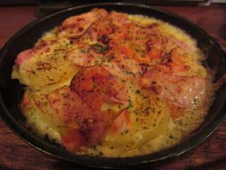 続いて、なぜか急に食べたくなった、ポテト・ベーコンチーズ焼き\500です。酒には合わないだろうな〜と思いつつも、焼けてとろけたチーズを食べたくなってしまったんですね。大きめに切られたポテトの上にチーズとベーコンを載せてオーブンで焼いたものですが、やはりとろけたチーズは好物です。まあ、冷えてしまうと食べにくくなってしまうのが難点ではあるんですが… (12.10) |