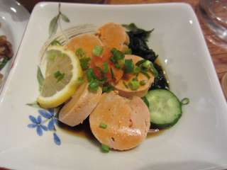 続いて鳥わさ。最近はレバ刺し問題から生肉が食べにくくなっていますね。今のところ、鳥と馬は大丈夫なようですが、これもいつまで食べられるのか… 軽くわさびの入った醤油ダレで和えられた鶏肉は焼き鳥とは違ったおいしさを味わうことができますね。 |