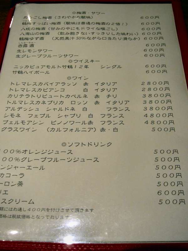 くじら、と言えばやはり酒がいいかな… で、まずは鶴齢(かくれい)純米無濾過生熟成 五百万石原酒\840をいただきました。酒にはお通し\400もついてきてしまうのは残念ですね。 |