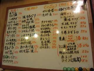 メニューに並んでいるのは魚系の品々ばかり。しかも、安いんです。すぐ近くの福ちゃんも安くて美味しい魚を食べさせてくれるんですが、あちらは立ち飲み専門。こちらは落ち着いて座って呑めるのがいいですね。何を食べようかと迷いましたが、トロサーモン\490とトロサバ塩焼き\490を注文しました。それにしても、ほとんどの品がお手頃なお値段。さらに居酒屋にも関わらずご飯とあら汁なんて物もあります。軽くビールを飲んで刺身などをおかずにしてご飯を食べに来る人も多いようです。 |