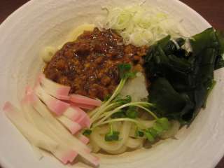 運ばれたうどんは、うどんの上に肉味噌、わかめ、刻みかまぼこ、カイワレなどが載っています。まずはグチャグチャと混ぜ混ぜしてからいただきます。 肉味噌はやや甘めですかね。味も濃いめで、うどんによく絡んでくれます。しっかりとボリュームもあり、お腹も満足です。ごちそうさまでした。 (16.7) ※いつの間にか閉店していました。 (18.5) |