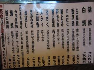 肴は当然の如く鰻串の一通り、うなぎ串焼きBコース(8本)\1933です。野菜焼きも付いたAコース(12本)\2495もありますがね。もちろん1本ずつ焼いてもらえます。でも、夜の部では食事をするか、鰻串を3本以上注文しなければならないルールだとか… なんかこちらの店、店独自のルールが多くっていい気分しませんな。 |