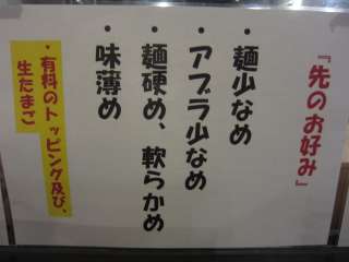 二郎系特有のトッピングは が注文時、野菜、 は着丼時にコールするようになっています。今回は麺の固さは普通でお願いしました。あとは、着丼時ににんにく、アブラ、ネギを追加しました。 |